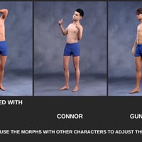 All morphs are dial controlled and can be individually dialed in and combined (also with morphs from other products) to get the results you want. You can just adjust the default Genesis 8 Male Base Character's body or also adjust other characters to make them more unique.