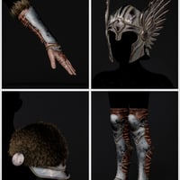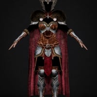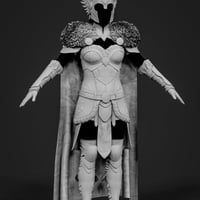 This striking ensemble includes a detailed dress, flowing cloak, rugged gloves, sculpted shoulder armor, helmet, and sturdy boots.