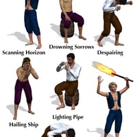 Castaway Action consists of a comprehensive collection of 60 action poses for marooned and shipwrecked sailors and pirates. When hurricanes, battles, and mutinies cast your mariners onto a deserted island, this is the pose set to ensure their survival.