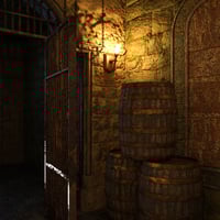 This 3D set features stone walls, iron-barred prison doors, torch-lit corridors, wooden crates, and a weathered, aged atmosphere ideal for storytelling scenes involving castles, fortresses, or secret underground lairs.