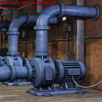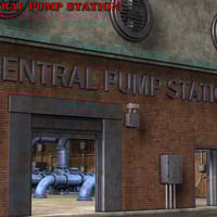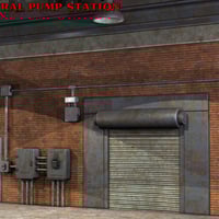 Highly detailed industrial pump station with movable roll-up door, two movable doors, 6 movable fans, twelve hide-able body parts and a Poser light set.