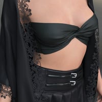 The sleek top pairs perfectly with the stylish skirt, complete with belts for a touch of edginess. The lace-trimmed robe adds a layer of sophistication, making this outfit perfect for any occasion.