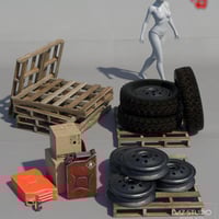 Make your vehicles, garages, warehouses, and survivor encampments look lived in and well stocked with this wide assortment of stowage props: Fuel cans, tires, pallets, boxes, crates, and even packing peanuts.