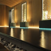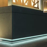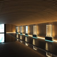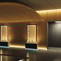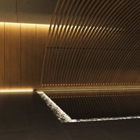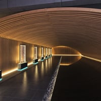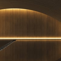 Kaari, a room, constructed of cherry wood panels against the harshness of concrete, giving it a warm and rich appearance.