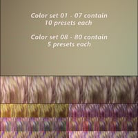 This set can be used with any strand based hair that you create in the strand based hair editor or any dForce strand based hair that you purchase from the store. There are 80 color sets that range from natural colors to fantasy colors. Sets 01 to 07 focus on single, natural colors while set 08 to 80 focus on being a mix of different shades of natural and fantasy colors. The included highlight and shine presets are essential to adjusting how the hair reacts with the lighting and for creating the darkest colors possible with this set . It is important to note that all thumbnails shown in the promos represent each hair color preset with the brightest highlight and shine setting under the same lighting. The highlight options include separate root and tip presets
