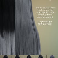Additionally, there are root and tip mixing presets allowing you to adjust how much the root and tip colors blend together and which of the two colors will be dominant. The tiling presets included allow you to further blend the hair colors to your liking and are divided up into presets for full color, root and tip colors with horizontal and vertical only options for each, all ranging from 1x1 to 10x10. All tiling presets are connected so you can use the Full Color 1x1 preset to reset the hair tiling.
