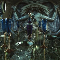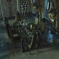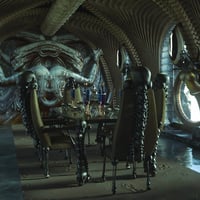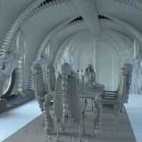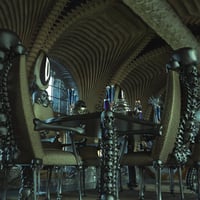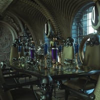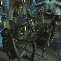 The dining room of the Xenoprime, an alien race descended from biomechanical evolution, is a cavernous chamber of sculpted darkness.