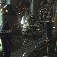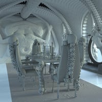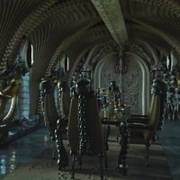 The space pulses with a cold, organic intelligence - walls resembling sinewy exoskeletons fused with blackened alloy, and furniture formed from living tissue intertwined with machine.